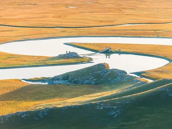 蜿蜒在巴音布鲁克草原上的开都河“九曲十八弯”,像是上苍为巴音布鲁克这个翡翠王国挽上的洁白的缎带。