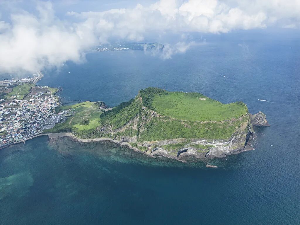 济州岛东线最为出名的当属城山日出峰,它是世界少见的保留完整的海底火山丘。顶部有个火山口,平凹像个海碗,夏天的时候就好像一块抹茶蛋糕,冬天蓝天大海白雪黑色礁石的搭配使视觉上产生强烈的碰撞!