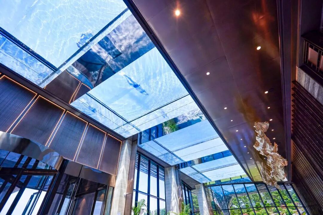 酒店由日本知名建筑大师隈研吾设计,无边际的透明屋顶泳池也是十分出片!泳池长约30米,从下方大堂看过去,仿佛是有人在空中畅游!