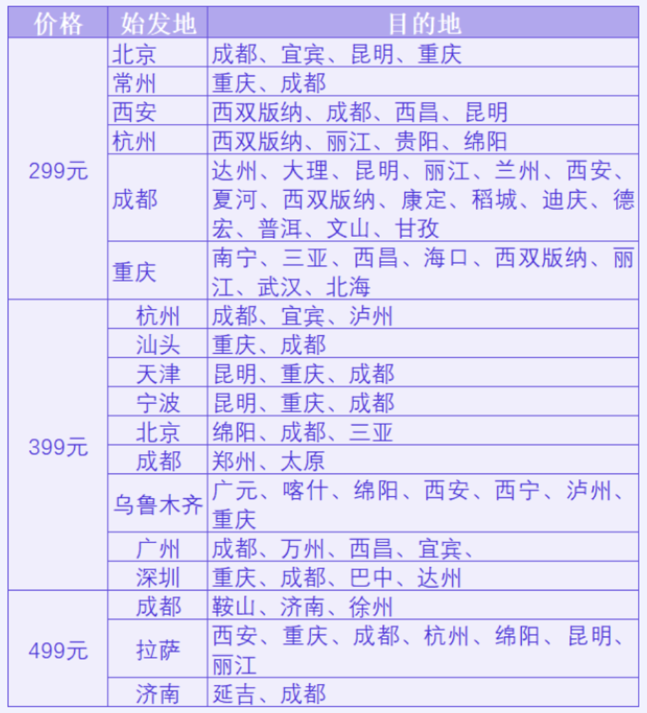 给大家highlight几个我觉得不错的:杭州飞版纳、西安飞版纳(现在去版纳正合适,非雨季,白天平均气温27度+)、重庆飞三亚、常州飞重庆/成都