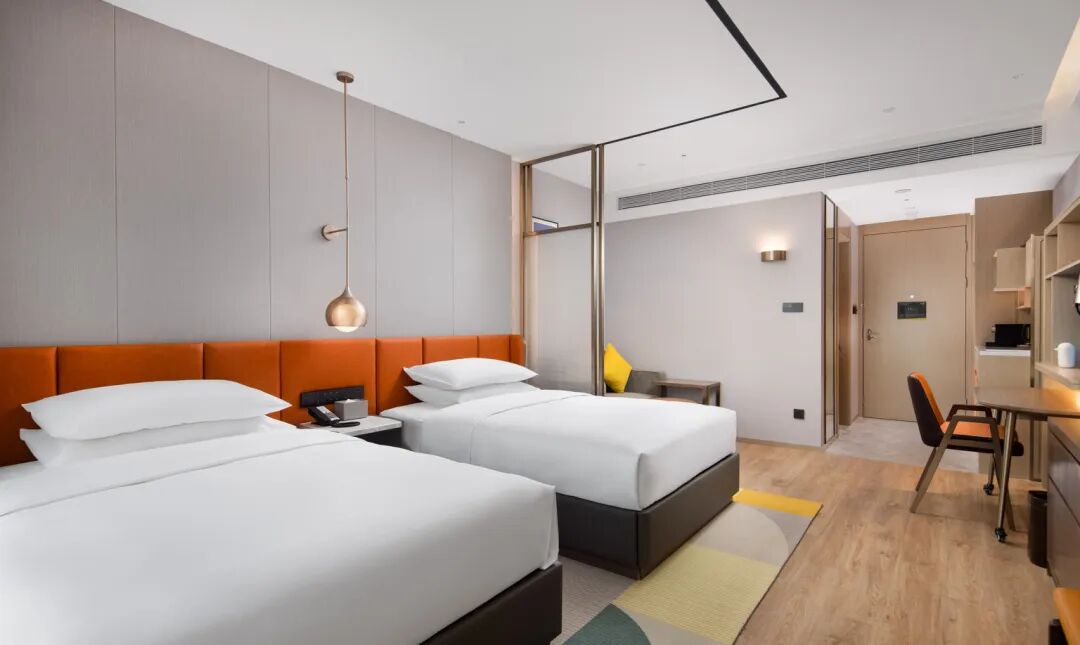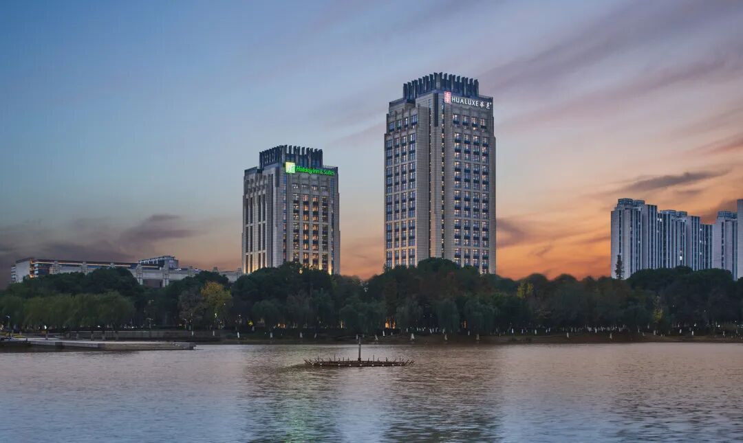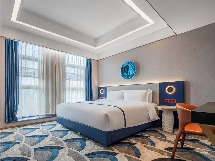 这家酒店是2023年新开的,位于江门市蓬江区下辖滨江新区,毗邻城市绿洲园山湖公园,举步可达演唱会热门场馆滨江体育中心。