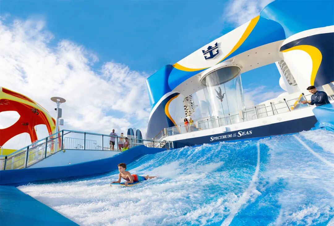 甲板跳伞:皇家游轮独有创新运动项目,垂直风洞产生强大气流,专业教练与全套装备模拟高空飞翔。