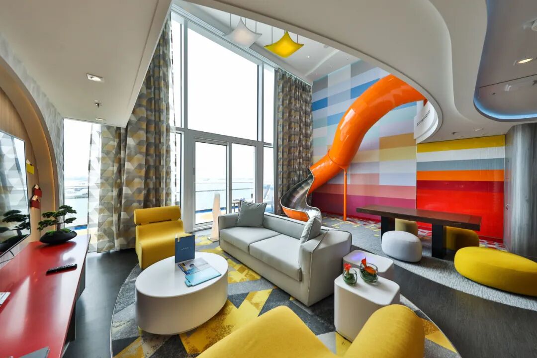 完美家庭套房:套房界的天花板,全船仅此一间!海上超级豪宅,含3间独立卧室,可容纳祖孙三代人 (含婴儿) 入住。从二层卧室直通客厅的儿童滑梯孩子们超爱,主卧设有海景浴室,套房内还配有卡拉OK和全套环绕声设备的娱乐室!(房间面积257㎡,阳台面积20㎡)