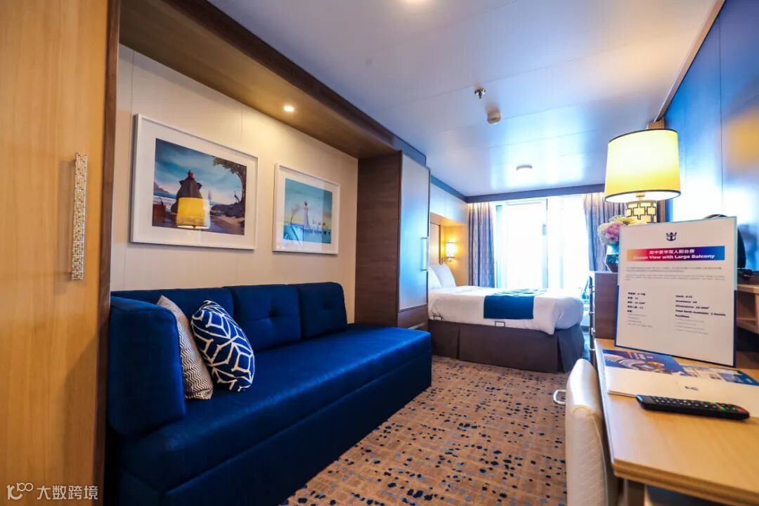 阳台房:无窗也同样精彩!入住科技感十足的舒适舱房,落地LED大屏实时展现海景和港口情况。(房间面积15-26㎡)