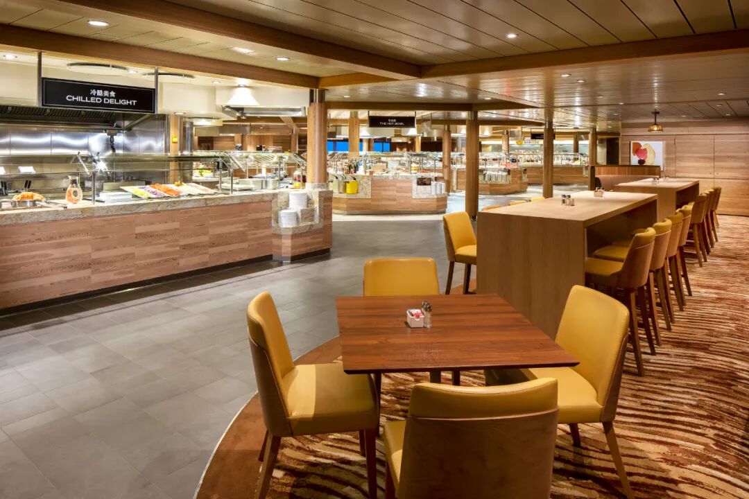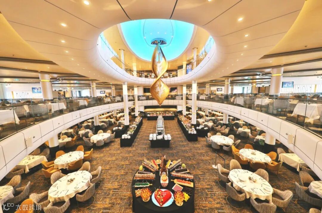 拥有3层挑高、可容纳1884人的盛宴式免费主餐厅。行程中每天早、中、晚提供不同的菜单,可供宾客单点环球美食,自由选择分餐或与家庭分享。