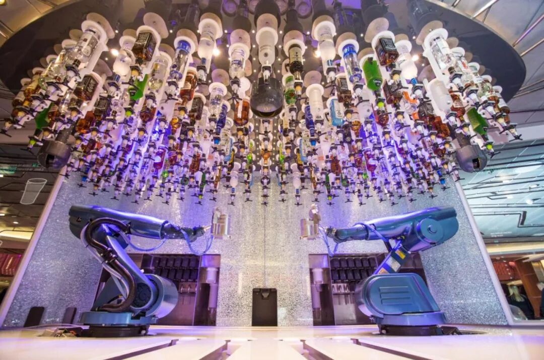 机器人酒吧科技亮点:房卡一刷,自动识别,炫酷触摸屏直接点酒两个机器人手臂在接收指令之后,2分钟超快地调出定制饮料或鸡尾酒,一天可调至1000+杯鸡尾酒!