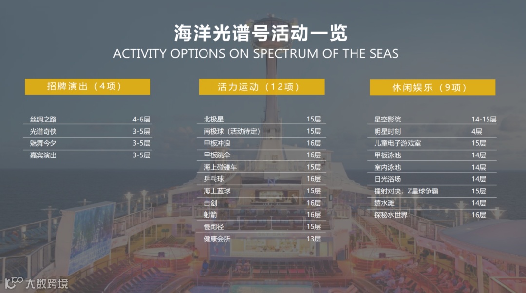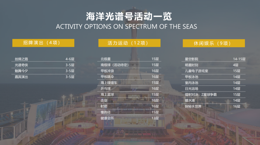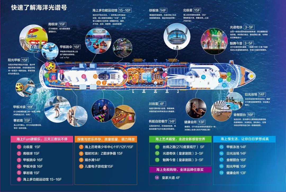 光谱号游轮特别适合家庭游,不用挪行李,不用换交通工具,就等于在豪华酒店酒店里玩着玩着,再无痛出国上岸溜一圈!更不用说海洋光谱号出了名吃得香玩的好,免费主餐厅一口气有三层,再有北极星、南极球、甲板跳伞等超出圈的项目,先放个图纵览一下: