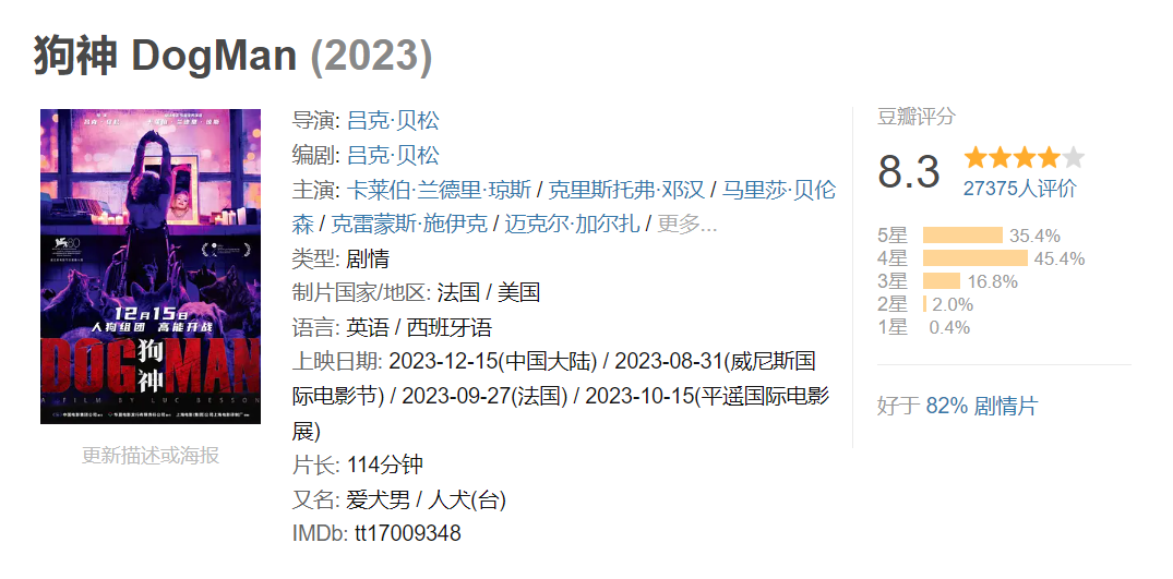 这位屡次获奖的导演并未停止他的创作之路,12月15日,吕克·贝松新片《狗神》正式上映。这是一个关于伤痛与治愈的故事,该片讲述了主人公道格拉斯(卡莱伯·兰德里·琼斯 饰)在饱经来自家庭、爱情、生存的摧残后,通过对狗的爱找回自我的故事。