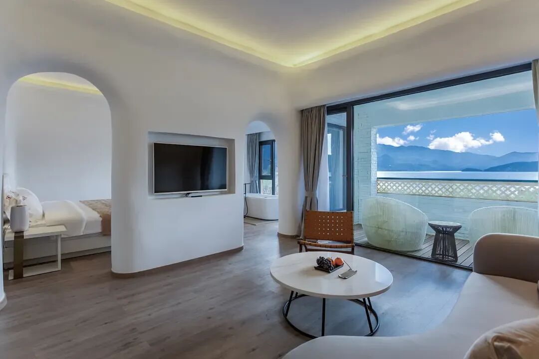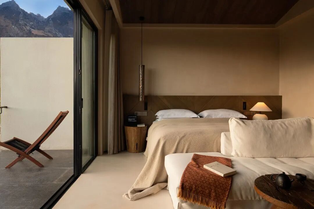 每个客房都附有私人山景阳台,室内各式传统图案的毯子、靠垫和壁挂增添了奇异的民族风情,与现代东方风格的室内陈设相得益彰。