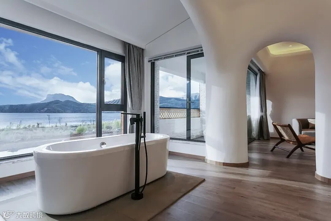 酒店一共有123间套房和别墅,绝大部分房间内就可以观赏到海拔5600米的玉龙雪山山顶,犹如玉龙侧卧云端。纳西建筑特色和江南园林风格相结合,曾经获得过亚洲最具影响力的DFA设计大奖。