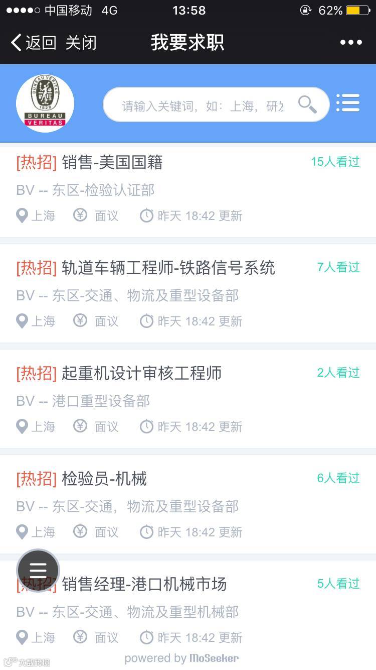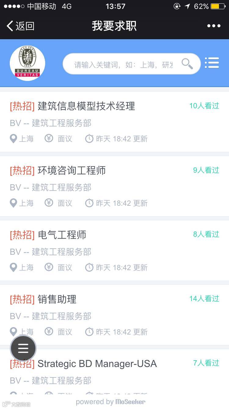 进入并点击“热招职位”,进入必维招聘专栏或者直接点击“我要求职”,选取你所向往的职位