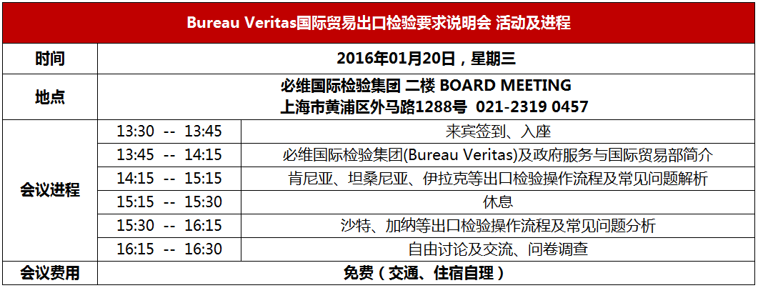 因此,BV必维国际检验集团政府服务与国际贸易部将于2016年1月20日在必维国际检验集团上海办公室举办“BV必维-国际贸易出口检验说明会”。