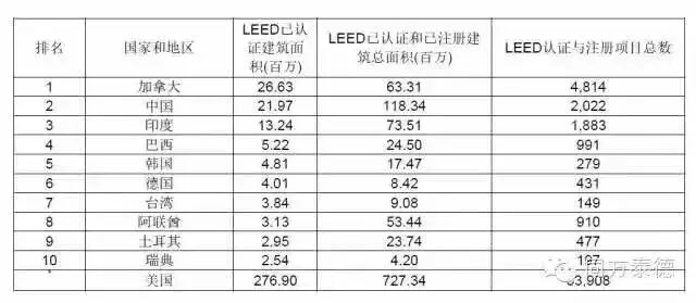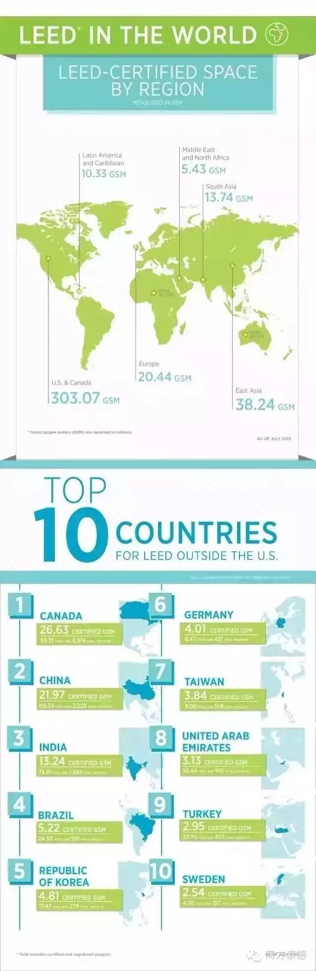 相关数据显示:2015年7月22日,美国绿色建筑委员会(USGBC)公布:中国名列全世界LEED十大国家和地区第二名。LEED是全球应用最广泛和最受认可的绿色建筑评价系统。这份十大榜单突出说明了美国之外的国家和地区在永续建筑设计、建造和市场转变上的显著进展,显示出全世界对于LEED绿色建筑不断增长的需求。