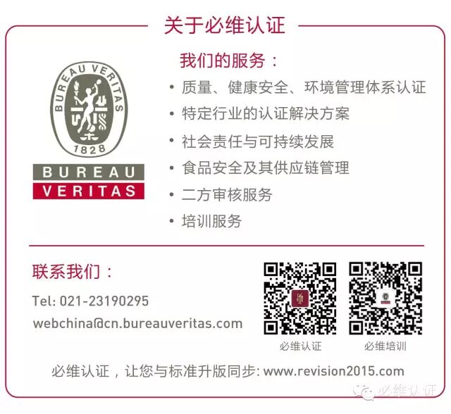 万众瞩目的ISO 9001:2015新版标准已于去年9月正式发布,宣告着第三代管理标准(G3)如期应境而来, 新版标准预测将在未来十年内引领企业发展和变革。当前企业既面临瞬息万变的外部环境,同时也伴随着内部的转型和变革,希望借新标之力成为企业转型变革的催化剂,为此, BV诚邀您与我们共同探讨ISO9001:2015新版标准,及如何利用ISO9001改版的契机在最新的形势下继续为质量管理提供坚实的基础,为组织持续成功增添力量,让您与同行一起交流和研习标准的要求,欢迎您参加!