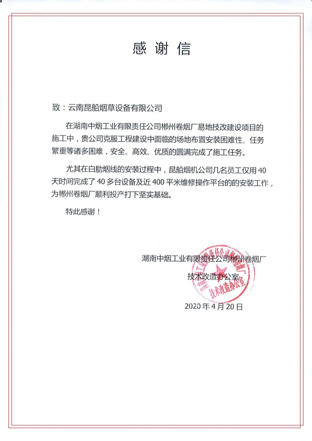 近日,中国船舶云南昆船烟草设备有限公司(以下简称:昆船烟机公司)收到湖南中烟工业有限责任公司郴州卷烟厂发来的感谢信,对昆船烟机公司在郴州卷烟厂易地技改建设项目的施工中排除万难,安全、高效、优质地圆满完成施工任务表示感谢。