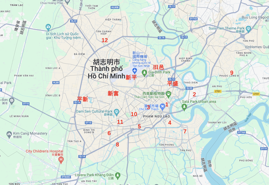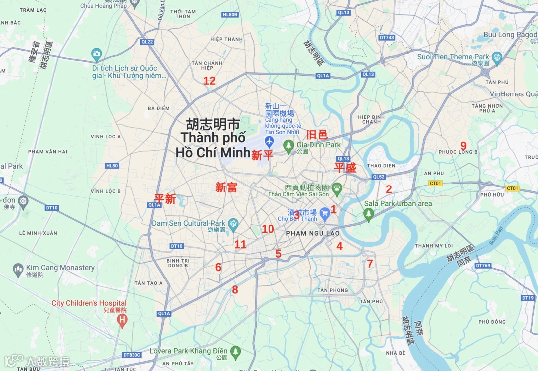 我们这次只着眼于胡志明市区部分,市中心区域以西贡河为界线,第1、3、4、7郡位于河西,第2郡和第9郡位于河东。