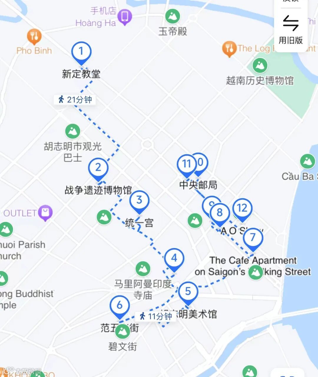 1.新定教堂(粉红教堂)- 2.战争遗迹博物馆 - 3.统一宫 - 4.滨城市场 - 5.胡志明美术馆 - 6.范五老街 - 7.咖啡公寓 - 8.胡志明广场 - 9.市政厅 - 10.中央邮局 - 11.西贡圣母大教堂 - 12.胡志明剧院看表演