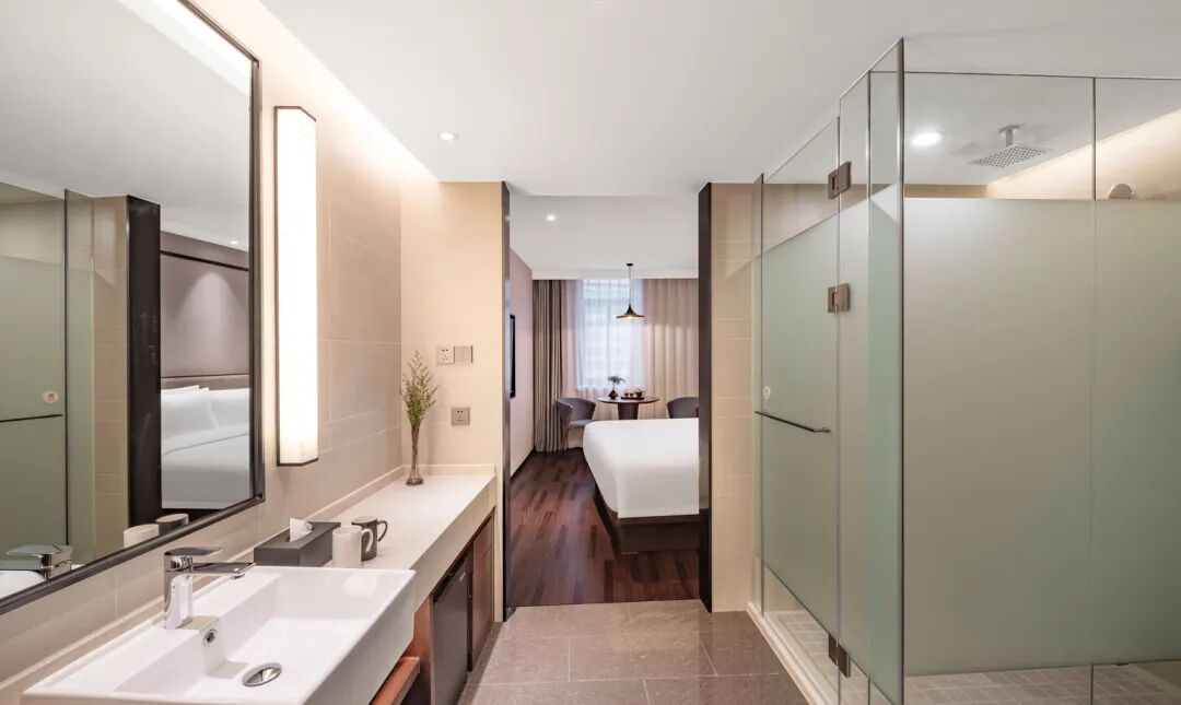 酒店整体采用新中式的装潢风格,随处可见“榕树”和“茉莉花”元素,户外中庭花园“拾光源”,灵感也是源自于中式园林,酒店还配套了恒温泳池和温泉泡池,以福州三坊七巷的飞檐马鞍墙为元素设计。