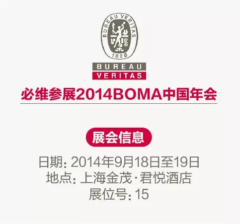 第二届BOMA中国全球年会暨高效运营与资产管理增值论坛——以国际标准实现运营管理高质量、低成本——于2014年9月18日至19日于上海金茂·君悦酒店举行。本次年会还将发布备受期待的《预防性维护指南》汉化版。作为《预防性维护指南》汉化的技术校正及协助方,必维应邀参展并将就“预防性维护与案例分享”进行演讲和分享相关经验。