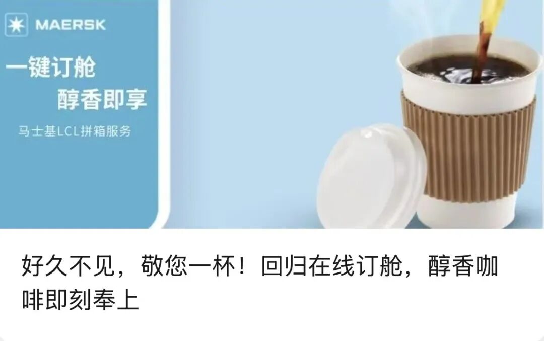 若您自 2025 年以来尚未通过马士基官网完成在线订舱,现只需完成一票拼箱(LCL)线上订舱,即可免费领取中杯咖啡电子兑换券一张!