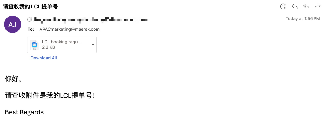 完成订舱后,将您的提单号发送至:APACmarketing@maersk.com