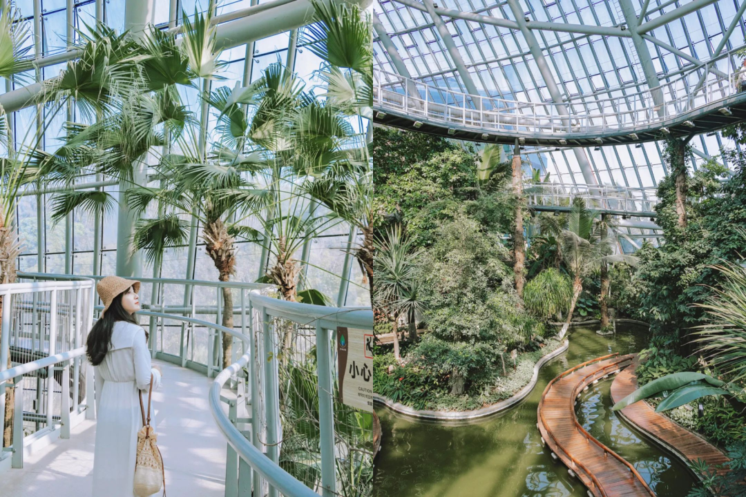 这座“巨型玻璃球”内,藏着上千种植物,下层碧水环绕,上层暖阳高照,沿着盘旋在各类植物中的弯道向上,近距离的观察着那些茁壮生长的植物,似乎是藏在惠州市的“热带雨林”。