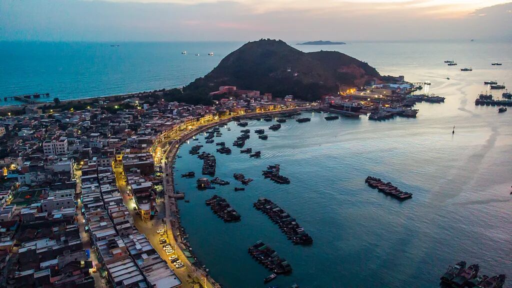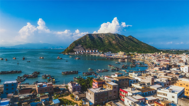 从天空之城旁边起飞无人机,往渔村方向取景,从天空俯瞰,渔村呈现弧形,沿海而建,有彩色房子,有海,有渔船,宛如中国版的意大利五渔村!