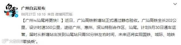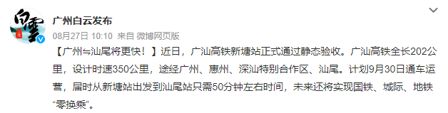 广汕高铁连接广州、惠州、汕尾三市,从广州出发到汕尾,原本需要2h左右,而开通后最快只需50分钟左右,未来还将实现国铁、城际、地铁“零换乘”!