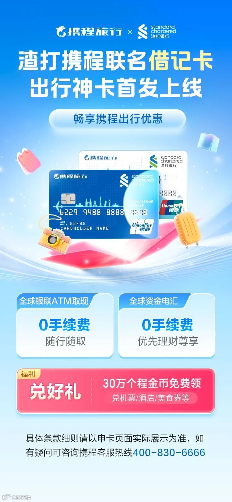 #渣打携程联名借记卡#8月惊喜来袭!新户开户达标即送30万程金币福利,可兑换机票券/酒店券/美食券/话费油卡等等好礼,一卡为你省所有~