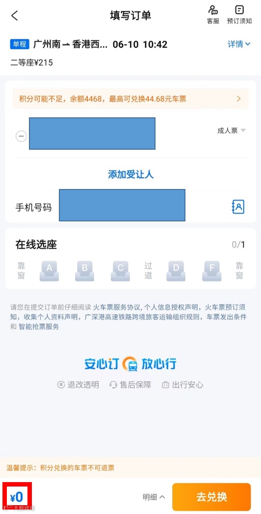 步骤五:只要积分够,输入消费密码,直接0元兑换高铁票!