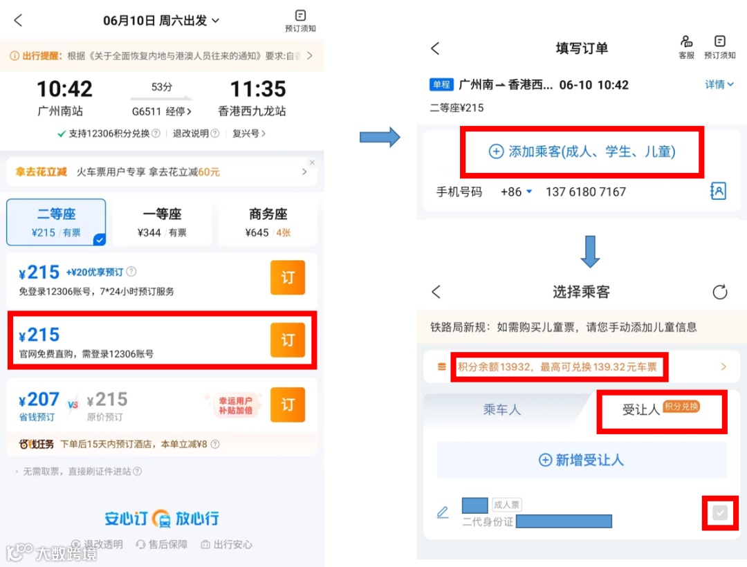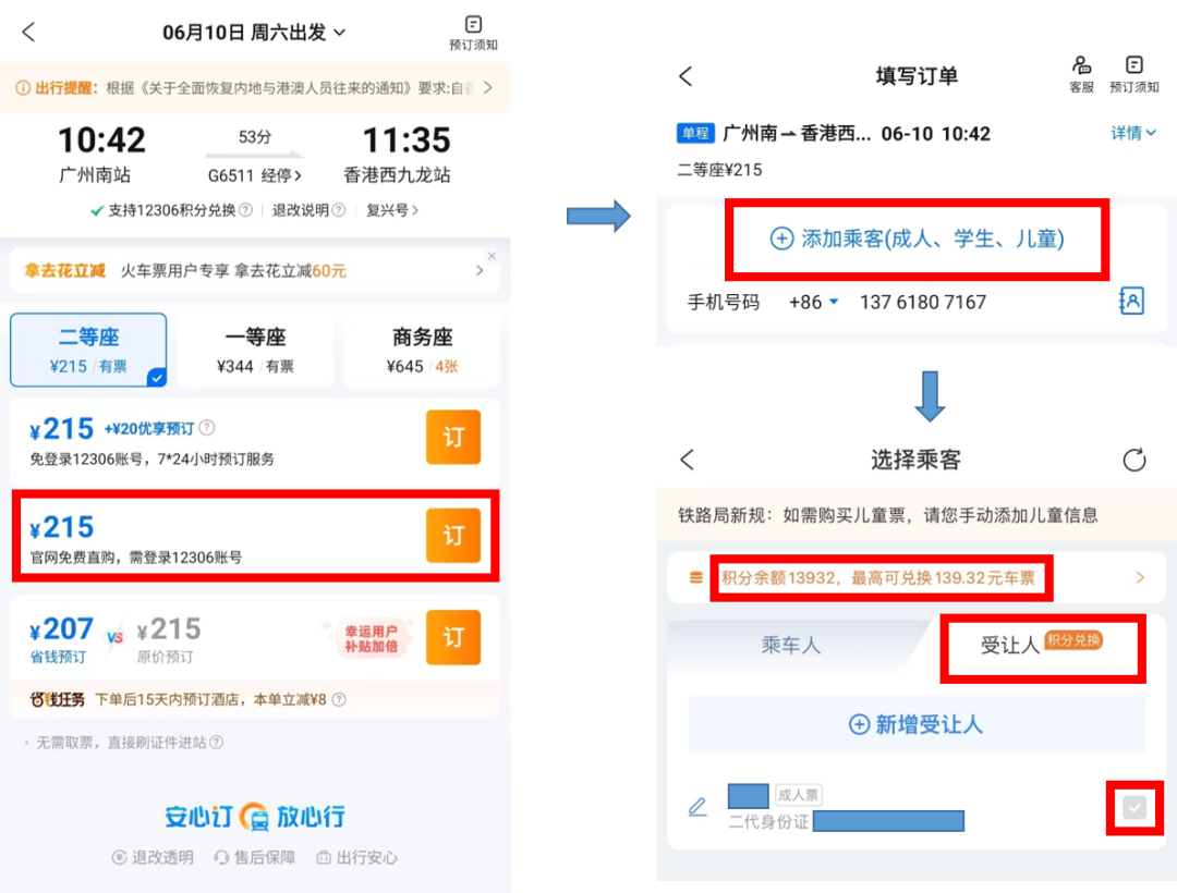 步骤四:点击添加乘客,再点击【受让人】,可以查询积分余额,勾选本次乘车人。