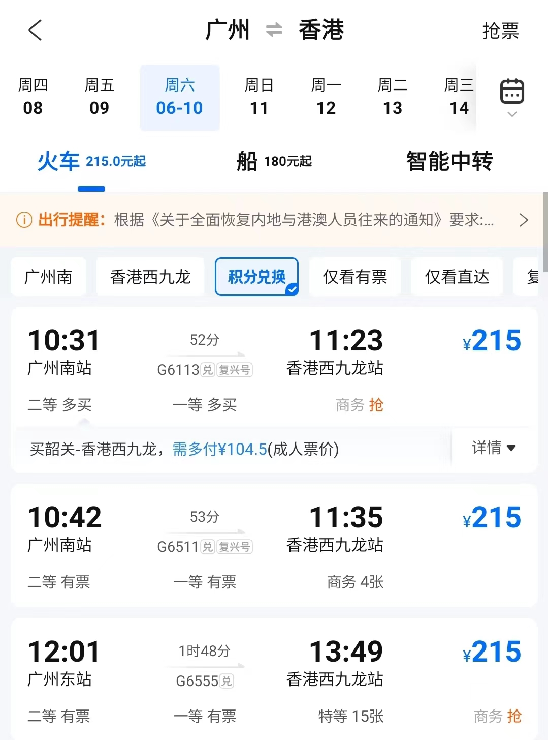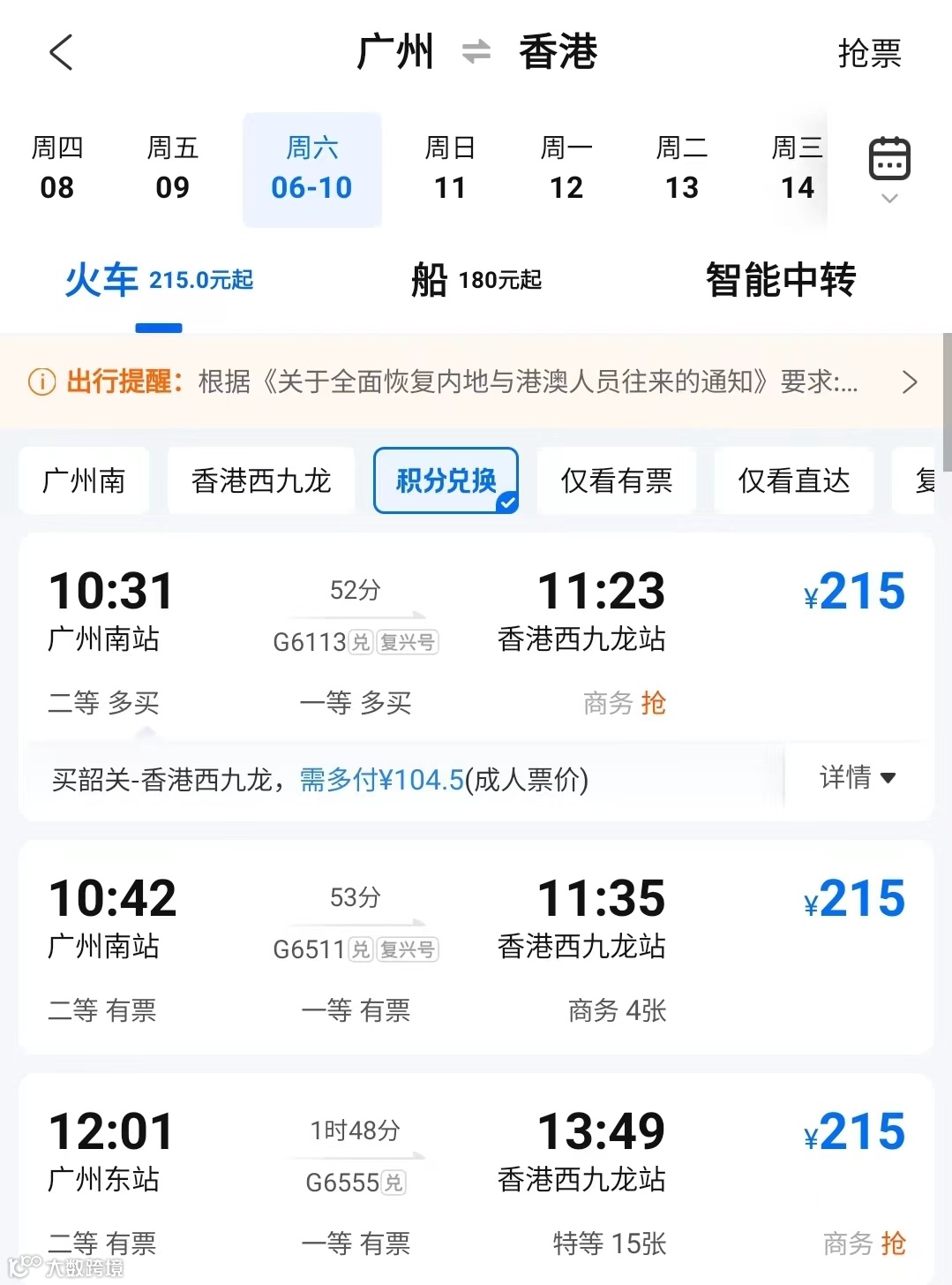 先说说带“兑”的车次,这个标志表示可以用积分兑换车票,每100积分可兑换1元;积分足够兑换票价时,可全额抵扣票款;积分不足以兑换票价时,不可与人民币混合支付;积分首次累积达10000分,获得首次兑换车票资格。