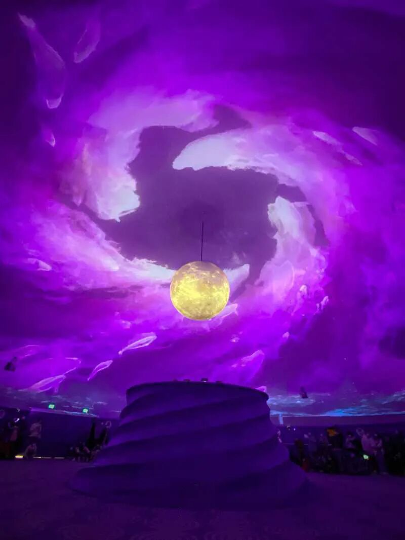 走进外观如同巨大星球一般的天幕影院,360°全息海洋主题下,一头巨大的蓝鲸从眼前飘过,耳畔传来如同波涛一般的起伏的海浪声,将大海的深邃与浩瀚展现在我们眼前,带来一场虚拟与真实交织的浪漫幻想。