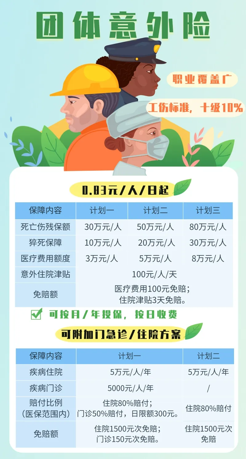 团意险价格跟员工个人的年龄基本无关,通常18-65周岁均可投保,同等保障额度下保费一致,但职业风险程度不同价格差异较大。普遍来说,绝大多数团意险标准化产品保障的职业为1-4类,5至6类职业需进行额外审核。