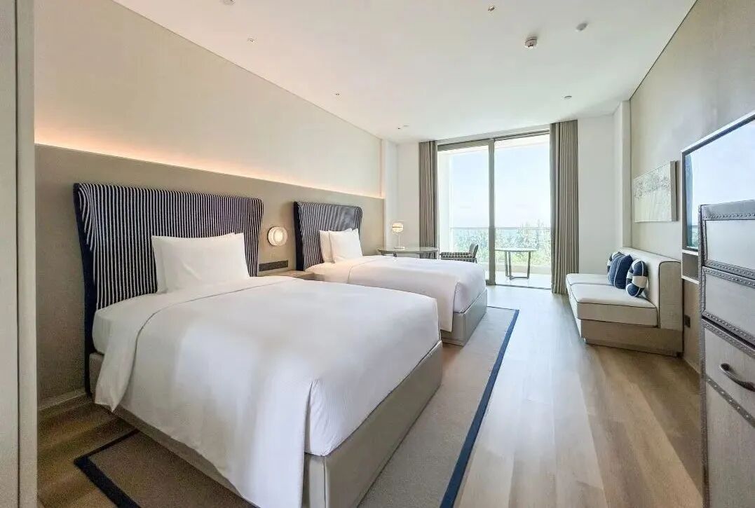 来说说房间,酒店总共116间房,我们这回入住的是海景双床房,直面一线海景,面积40㎡,房间主打清新的浅色调,灵动轻盈,床品睡起来也很舒服。所有房间都有阳台,早晚吹吹海风惬意极了,夜晚星空也很透彻,繁星漫天,很多年没看到这么多星星!