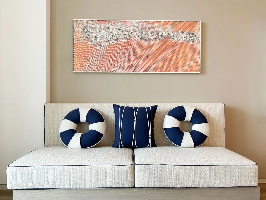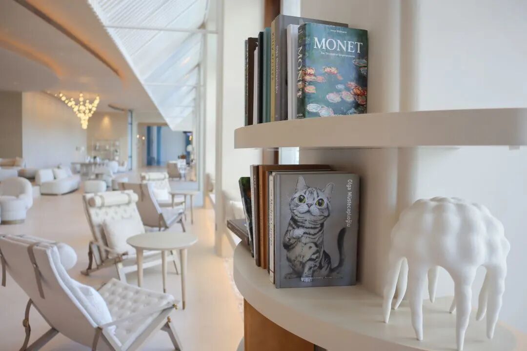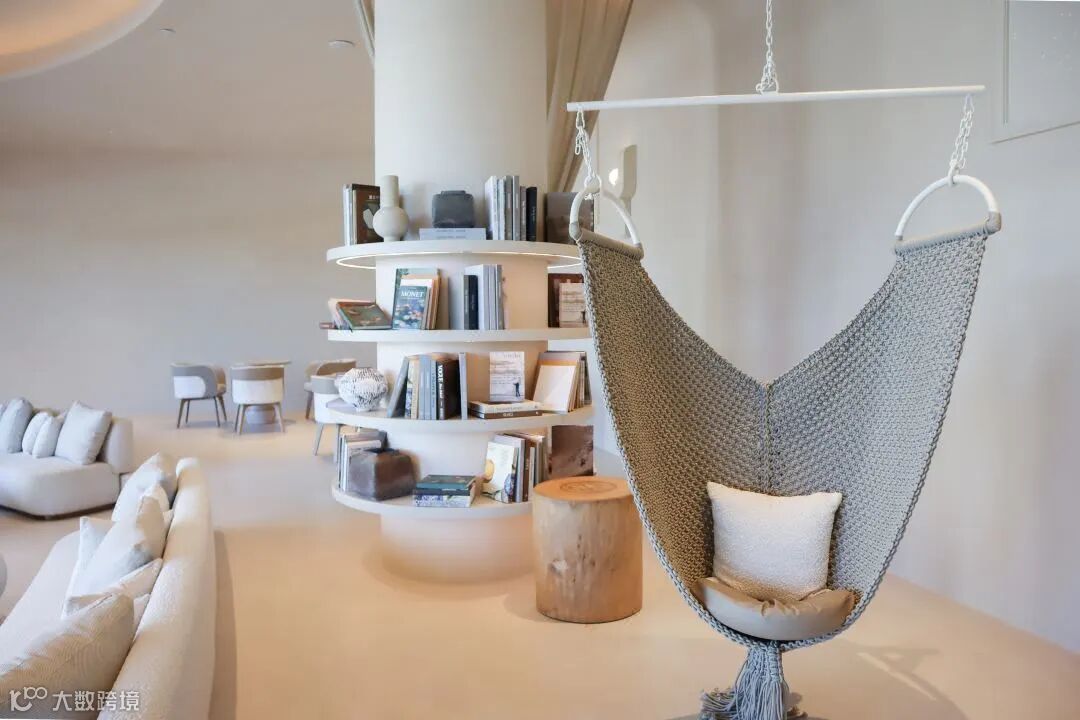 图书馆简直像一个奶油风的样板间,奶乎乎的!头顶天花板造型来源于海浪冲刷沙滩后留下的痕迹,褐白相间的条纹遮阳伞、鹅卵石样式的沙发椅、沙滩折叠椅,稳稳拿捏奶油风的精髓。