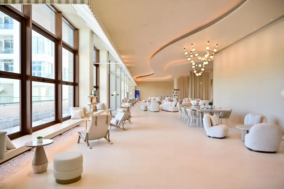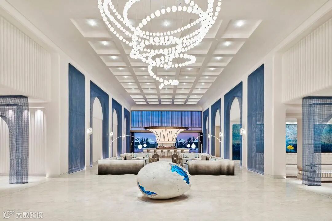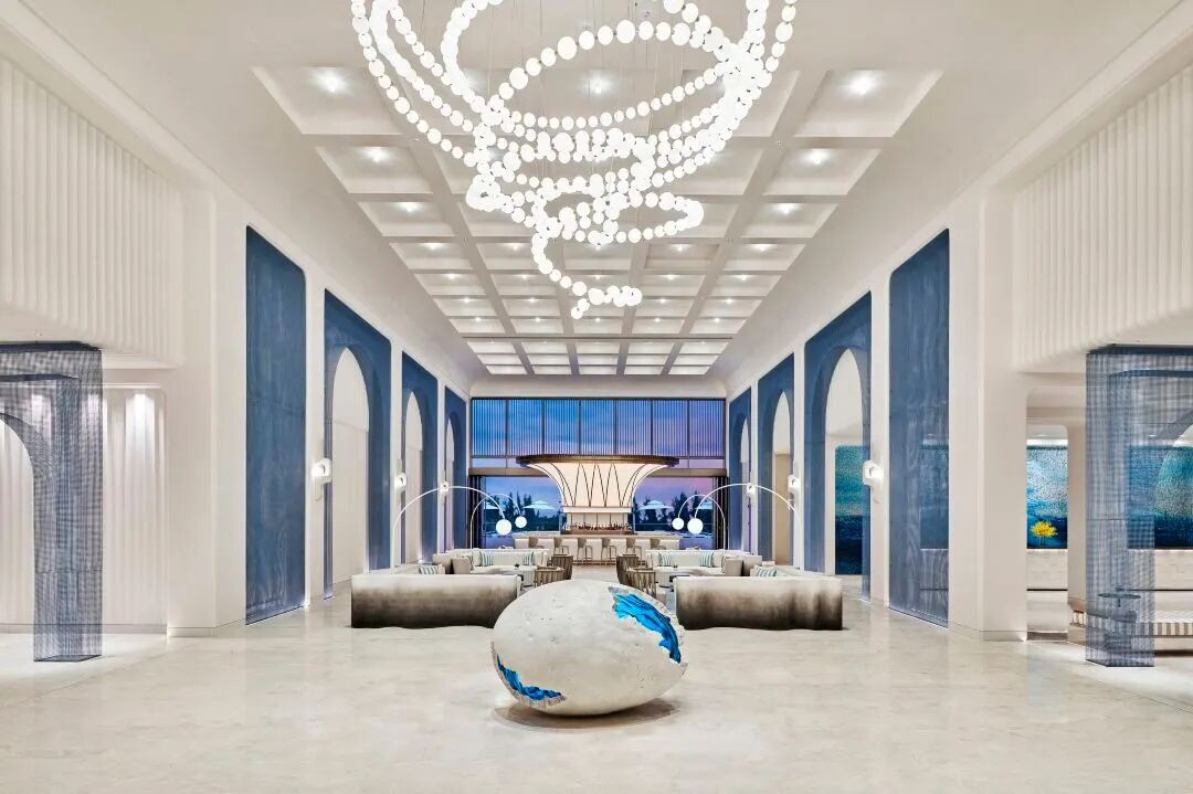 高近十米的大堂以白与蓝为主基调,宝石上方悬挂着一串串珍珠形状的星辰吊灯,墙面蓝色渔网式的装饰,将海底的珊瑚与贝壳点缀其中。