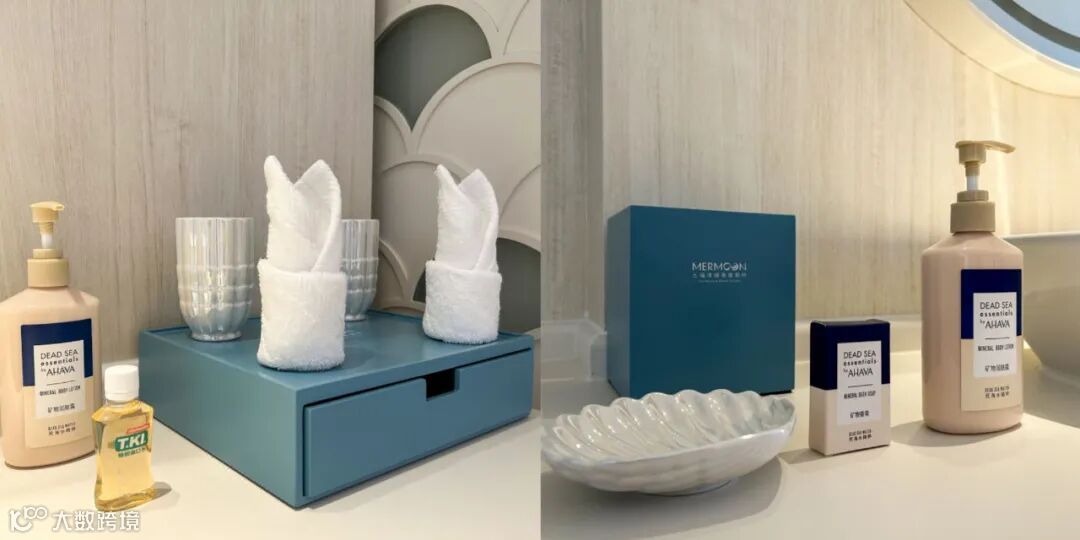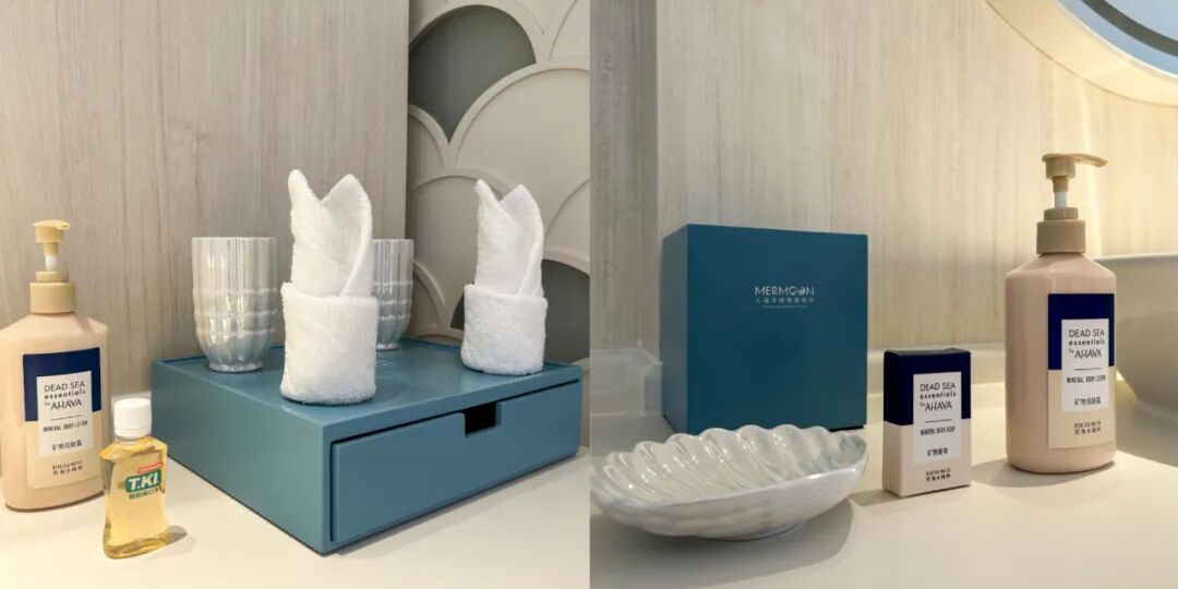 干湿分离配智能马桶,每间房都有浴缸。小细节上很加分,连杯子和托盘都是好看的贝壳样式,有种住进海底宫殿的感觉。洗护备品是以色列死海矿物系列。