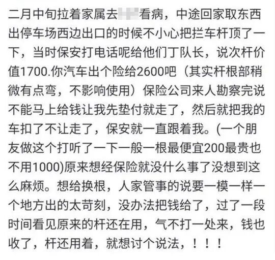 根据发帖内容,该网友不慎将某停车场出口起落杆撞弯,遭对方索赔2600元,然而,事后多日旧杆仍在使用,网友因此心生不满。