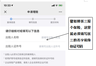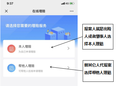 如果出险人是本人就选择【本人理赔】,非本人报案就选择【帮他人理赔】