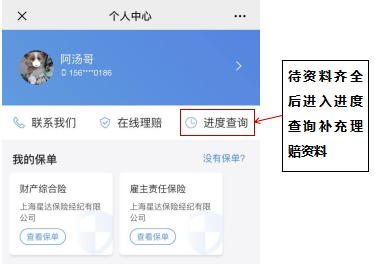 7)完成线上报案及提交理赔资料,等待保险公司审核,理赔进度会登录【个人中心】查询。若审核后资料不符或缺失,则需补充相应材料后再行上传,审核完成后可寄出资料给保险公司,邮件地址请到行者保公众号内看保险理赔流程,根据地区的不同选择邮寄地址。