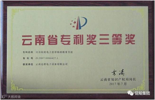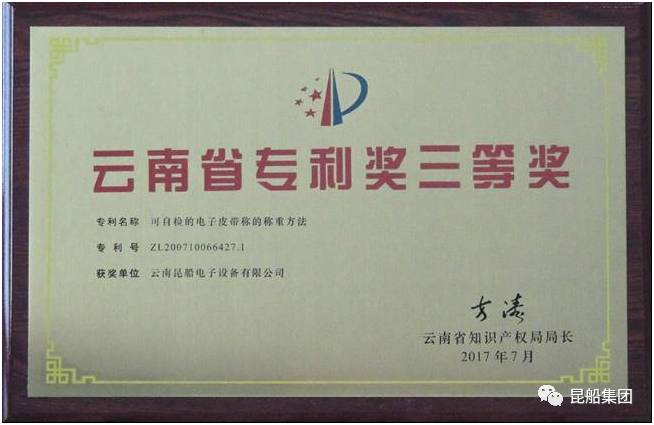 近日,昆船电子公司发明专利“ZL200710066427.1 可自检的电子皮带秤的称重方法”获2017年云南省专利奖三等奖。
