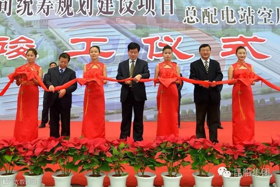王根余、王洪波和张义辅为竣工剪彩。随后,王董事长宣布:昆船公司统筹建设项目805总装总调工房、808总配电站空压站房竣工并启用!