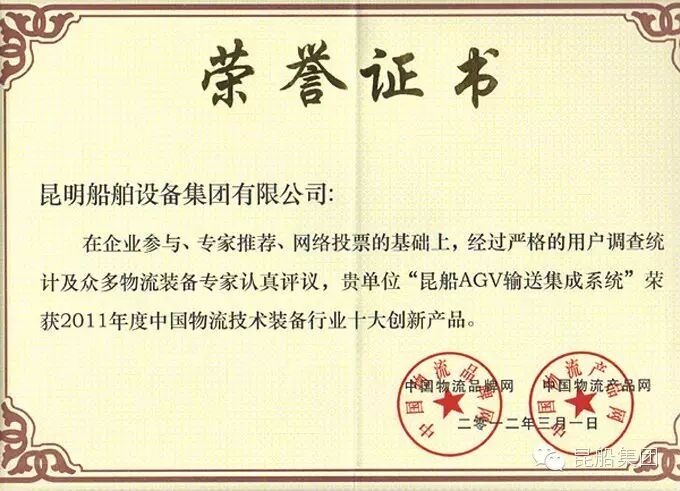 2012年5月,在企业参与、专家推荐、网络投票的基础上,经过严格的用户调查统计及众多物流装备专家认真评议,“昆船AGV输送集成系统”荣获2011年度中国物流技术装备行业十大创新产品。