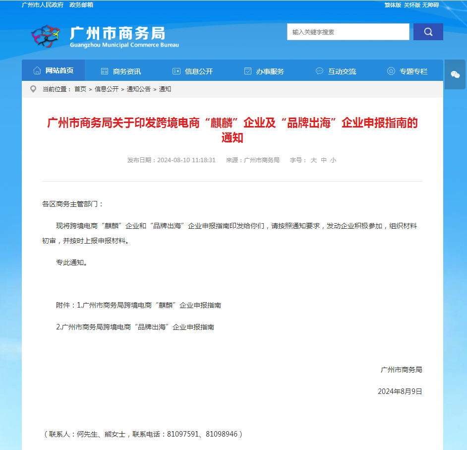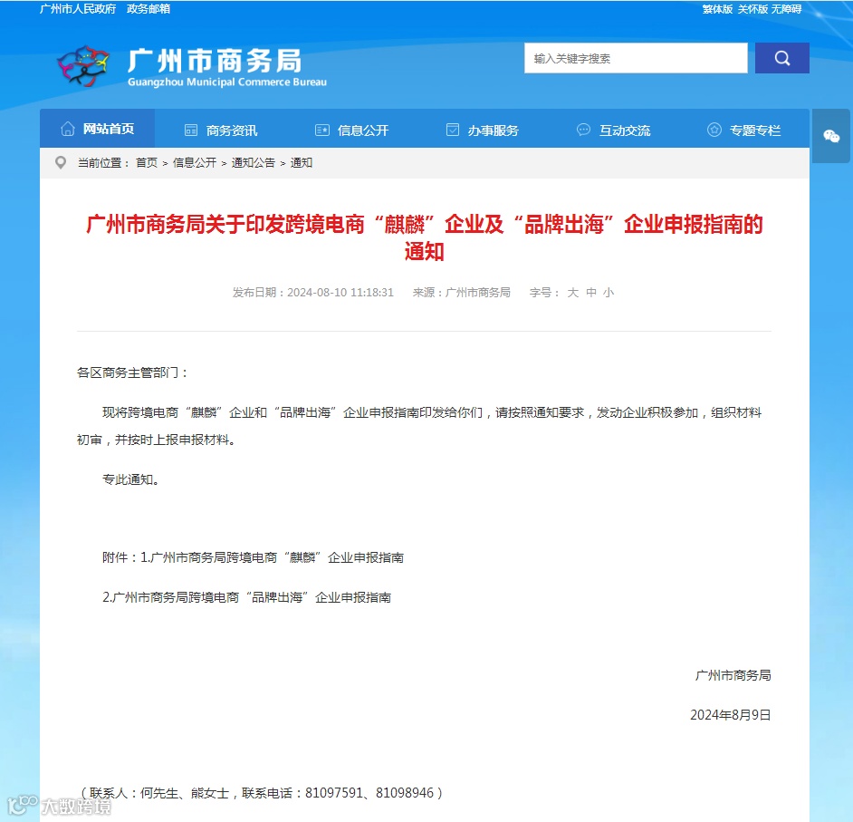 为落实《广州市进一步推动跨境电子商务高质量发展若干政策措施》,市商务局印发了跨境电商“麒麟”企业及“品牌出海”企业申报指南,拟遴选一批跨境电商“麒麟”企业及“品牌出海”企业,给予资金扶持奖励,进一步加强培育跨境电商主体,加快推动广州品牌跨境出海。