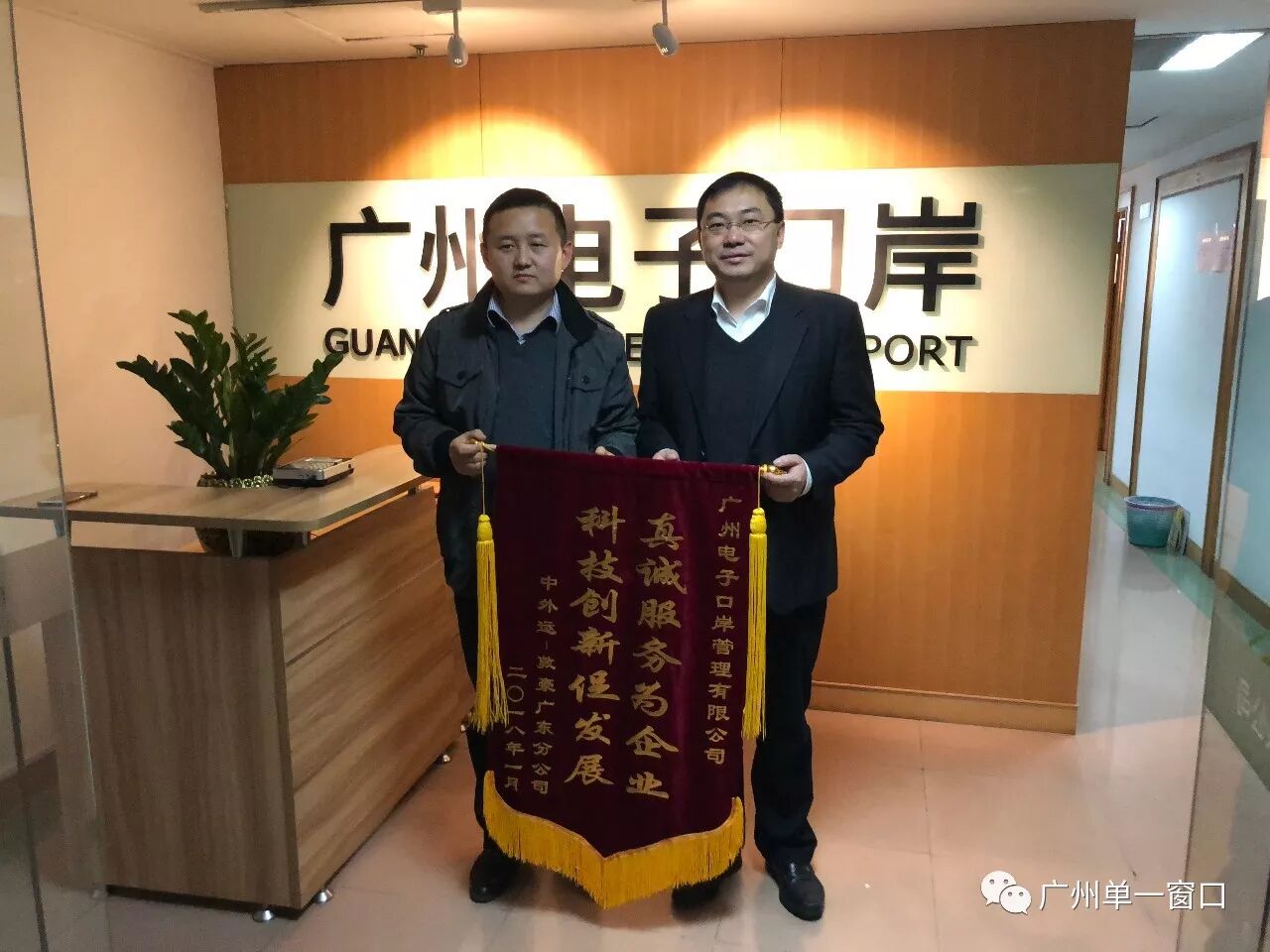 1月12日下午,中外运-敦豪国际航空快件有限公司(DHL)南方区口岸总监刘伟先生给中国(广州)国际贸易单一窗口送来“真诚服务为企业,科技创新促发展”的锦旗,感谢广州“单一窗口”聆听企业意见,根据企业需求,开发了货物申报预录入系统,解决企业业务运作中重复工作、信息易出错等问题,提高了通关效率。