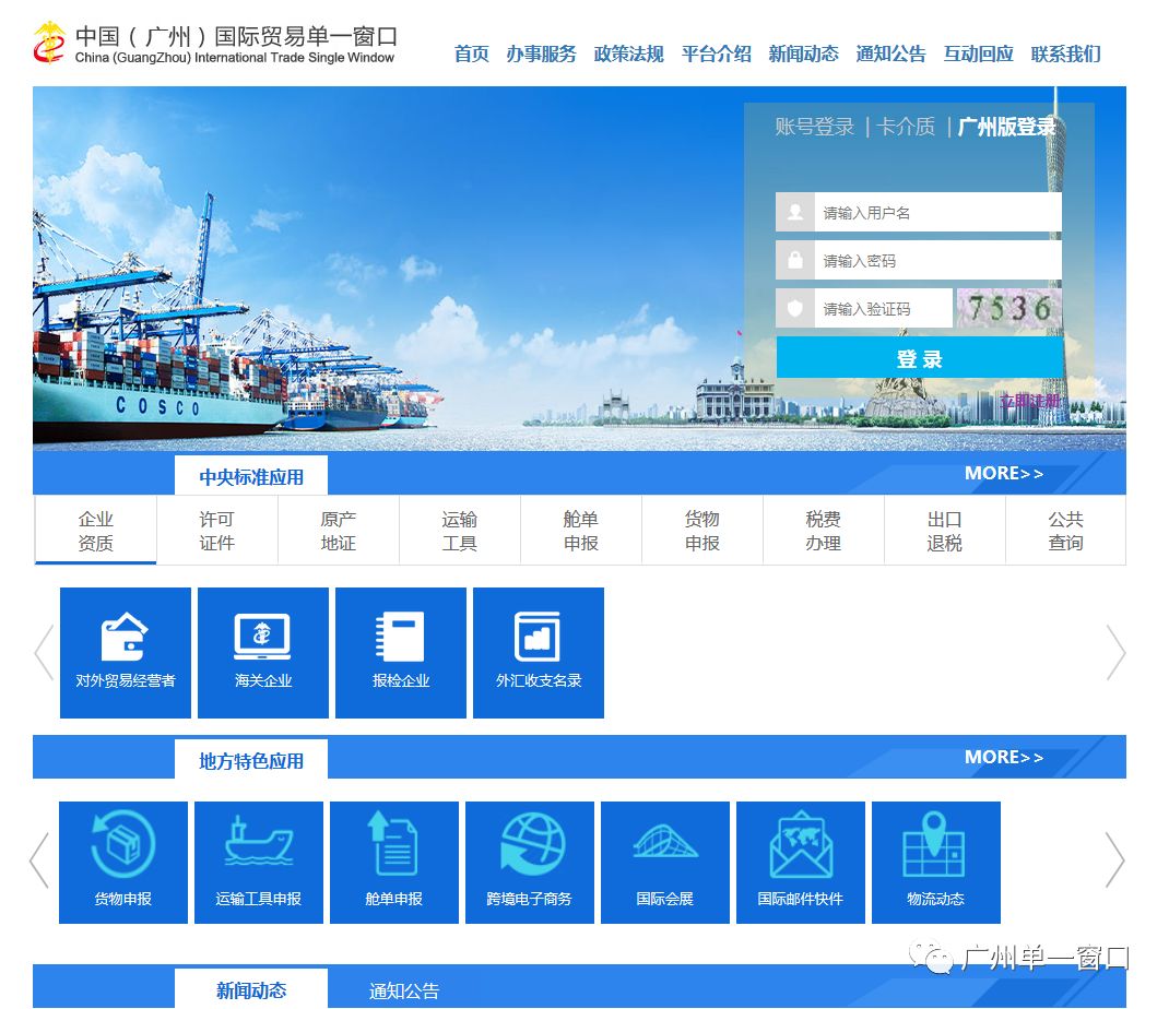 根据《国家口岸管理办公室关于印发“单一窗口”统一门户建设规范的通知》(国岸发【2017】20号)关于统一界面、统一标识、统一域名规范原则的要求,2018年1 月4日,中国(广州)国际贸易单一窗口完成了网站首页的更新改造,在首页同步展示国家标准版及广州版“单一窗口”的功能。