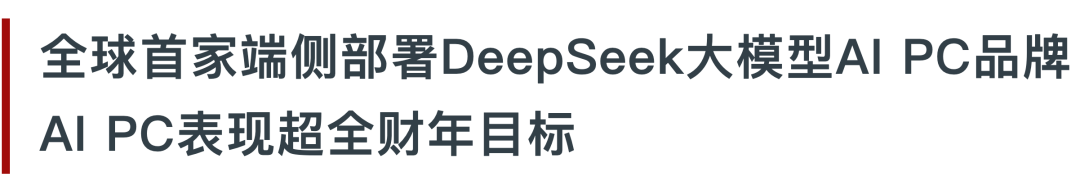 2月20日,联想集团发布2024/25财年第三财季业绩,并介绍了在混合式人工智能领域战略布局的新进展。联想集团执行副总裁兼中国区总裁刘军在当天的媒体沟通会上介绍说,聚焦混合式AI,联想正与DeepSeek在个人智能与企业智能两大领域,开展更全面、深入的合作。