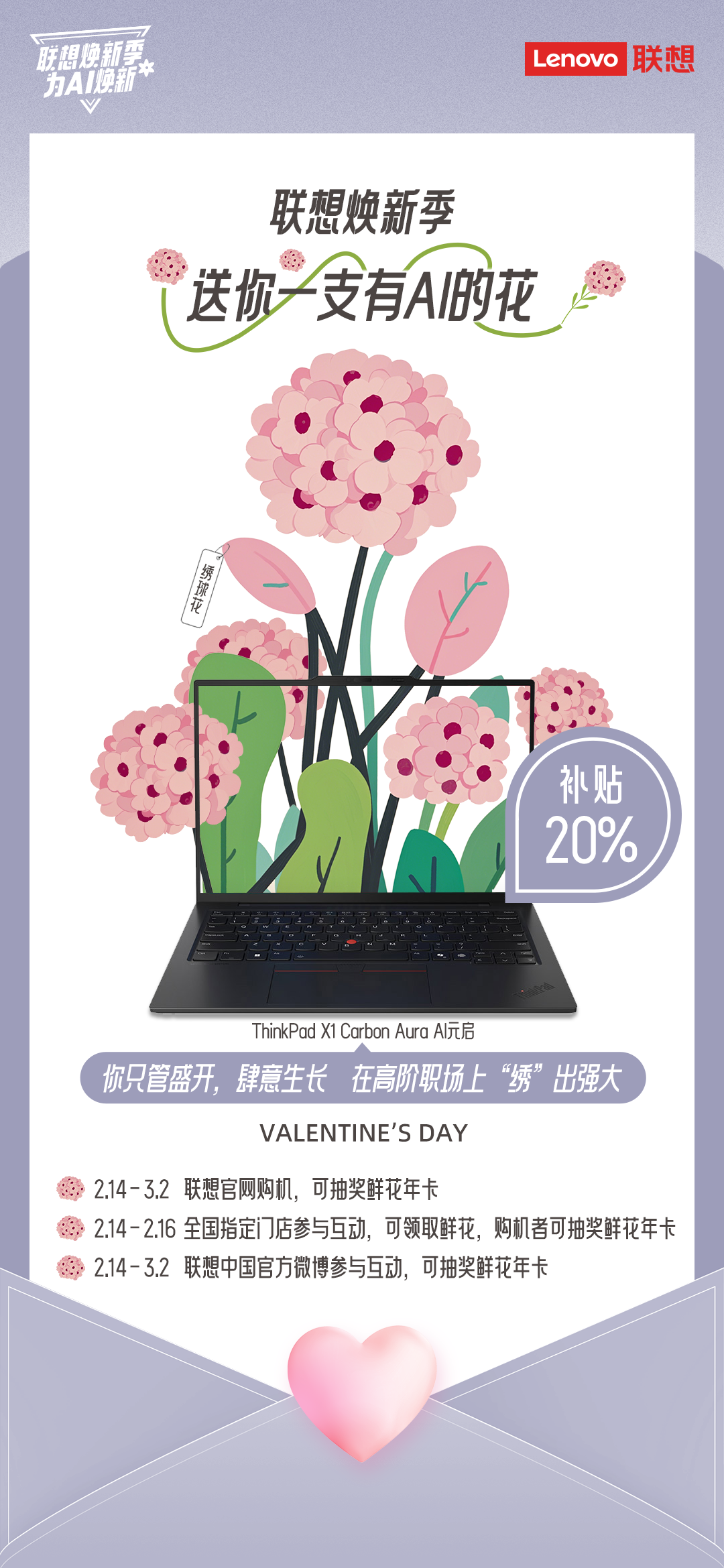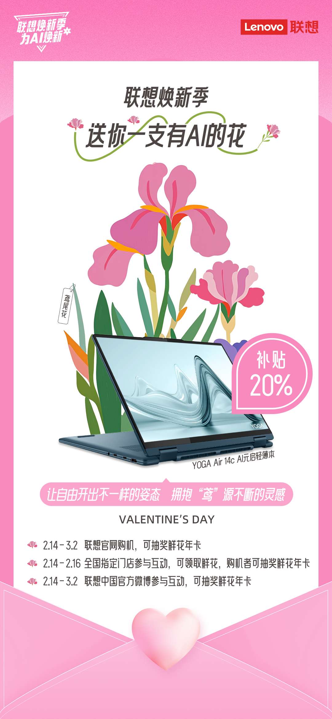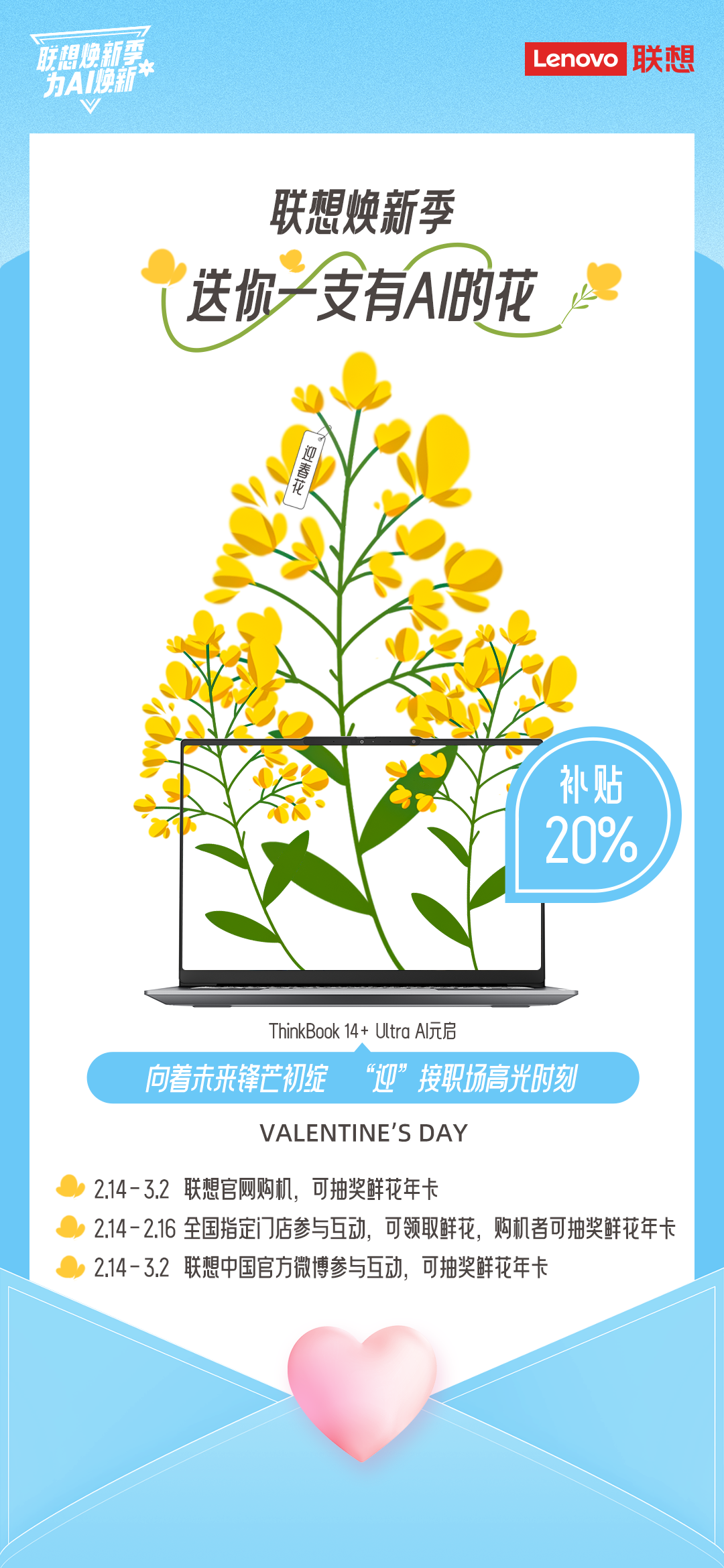 体会焕新“AI”意不止局限在线下。本次焕新季践行“以用户为中心”的理念,构建了线上线下联动的全场景体验。2月14日至3月2日,关注联想中国官方微博参与互动同样有机会解锁全年鲜花卡浪漫好礼,联想官网购机用户同步享有鲜花年卡抽奖权益。后续联想还将开展企业园区、京东园区等场景的鲜花互动,让AI的温度持续传递。