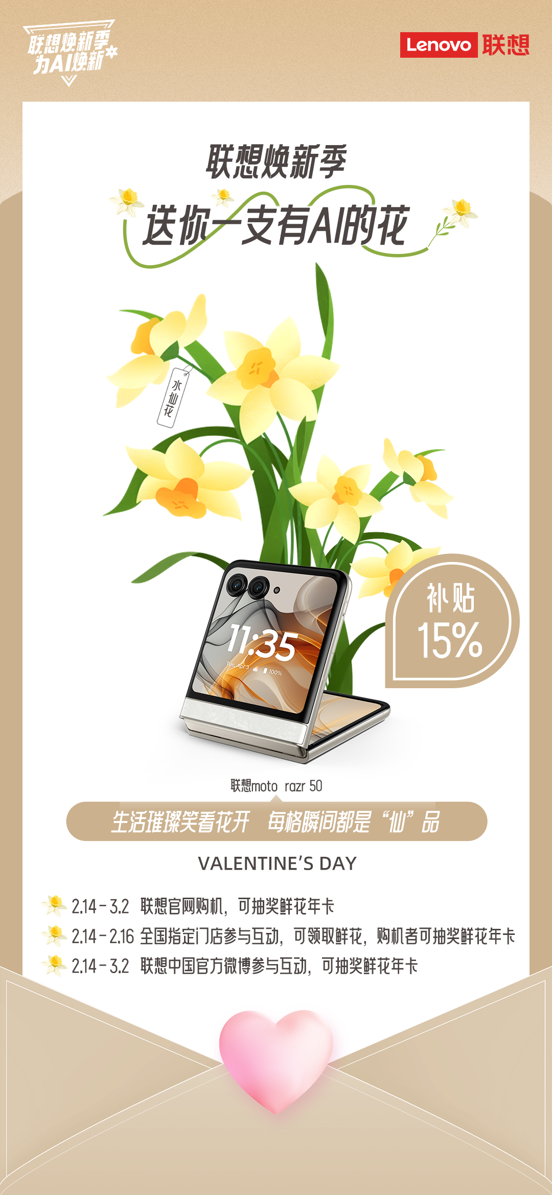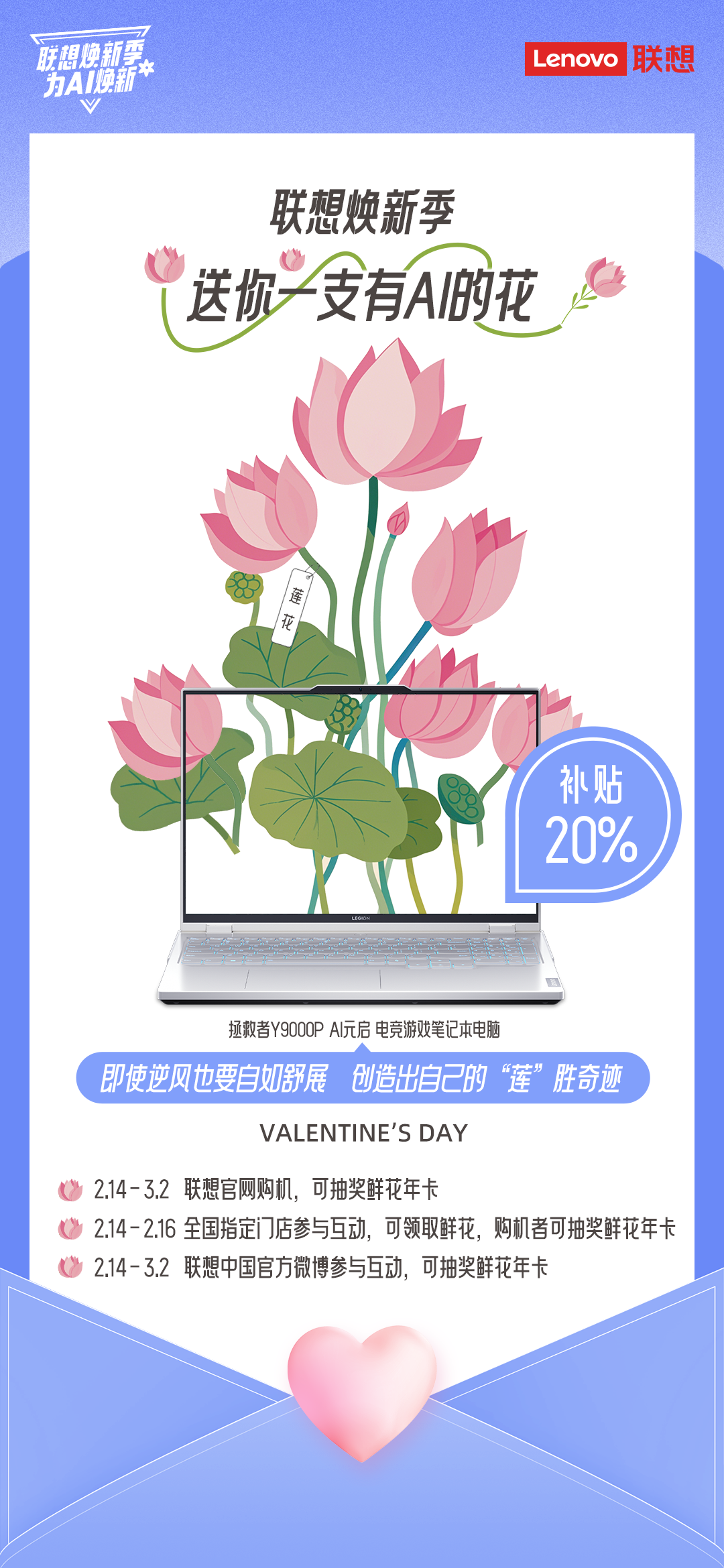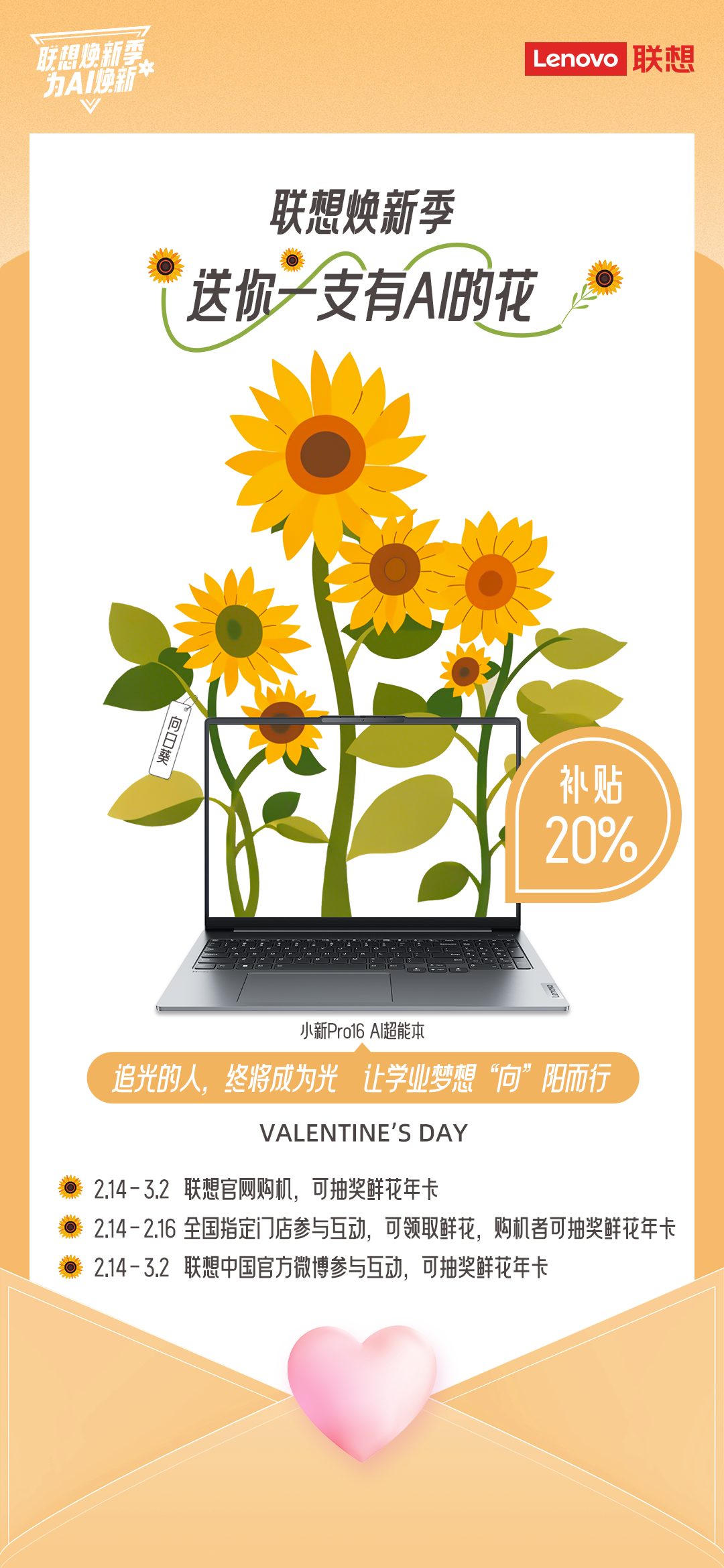 体会焕新“AI”意不止局限在线下。本次焕新季践行“以用户为中心”的理念,构建了线上线下联动的全场景体验。2月14日至3月2日,关注联想中国官方微博参与互动同样有机会解锁全年鲜花卡浪漫好礼,联想官网购机用户同步享有鲜花年卡抽奖权益。后续联想还将开展企业园区、京东园区等场景的鲜花互动,让AI的温度持续传递。